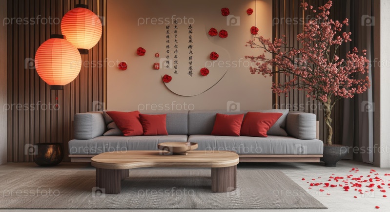 Современная гостиная в стиле дзен с красными фонарями и восточным декором