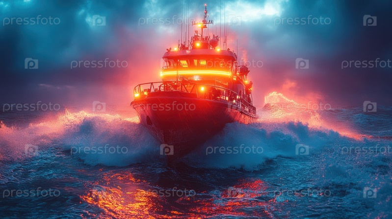 Ярко освещенная спасательная лодка движется по темным волнам океана на закате, создавая резкий контраст теплых и холодных цветов