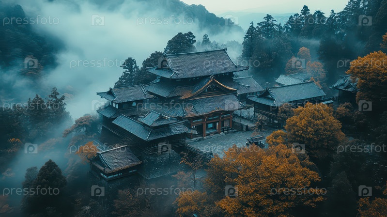 Традиционный японский храм в туманном лесу