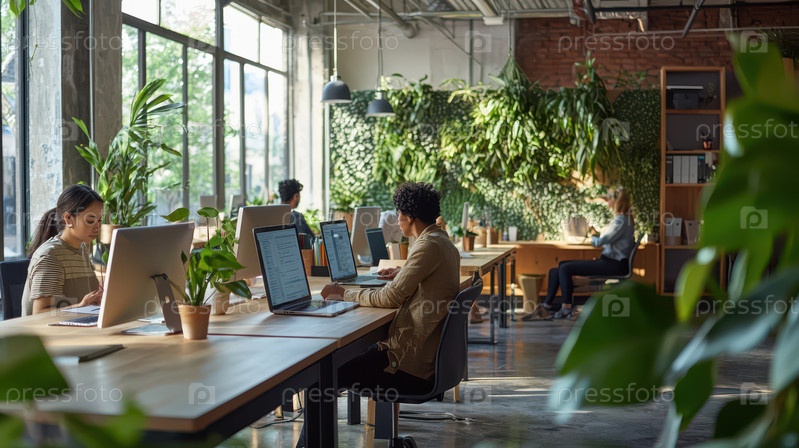 Современное коворкинг-пространство, где люди работают за ноутбуками в окружении растений, предлагающее спокойную и продуктивную обстановку для творчества и концентрации