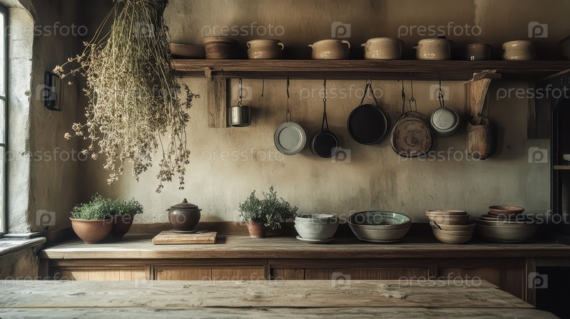 Кухонная столешница в деревенском стиле с керамической посудой и сушеными травами