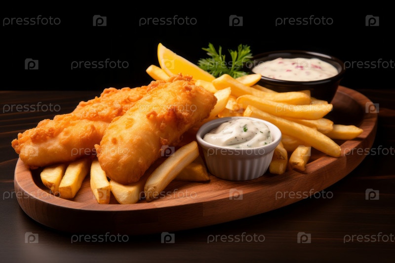 Блюдо из рыбы и чипсов на минимальной кухне. Домашняя или еда на вынос. Традиционная типичная британская еда. Картофель фри с соусом