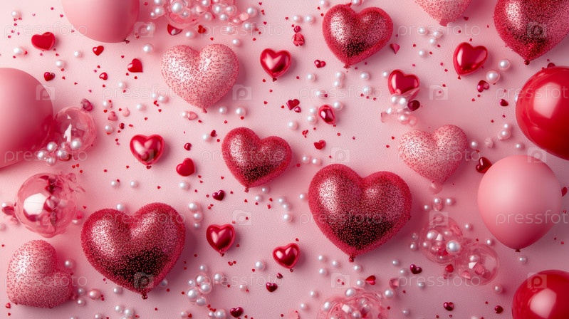 Воздушные шары в форме сердца, парящие среди празднования конфетти