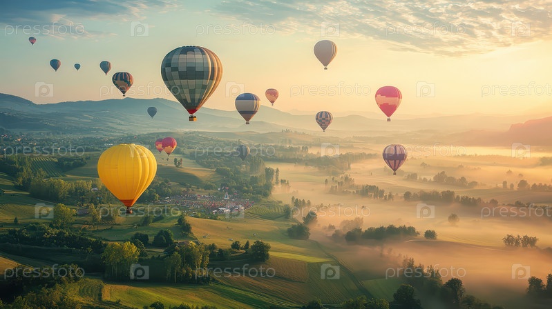Красочные воздушные шары на рассвете над горным ландшафтом