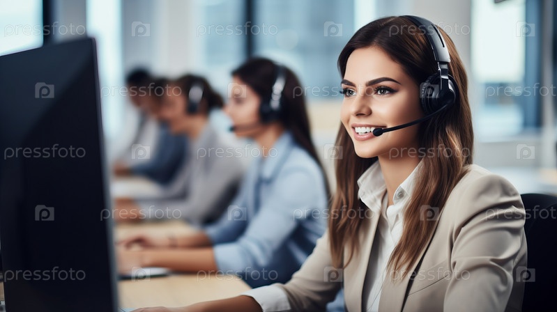 Молодая дружелюбная женщина-оператор с гарнитурой, работающая в колл-центре