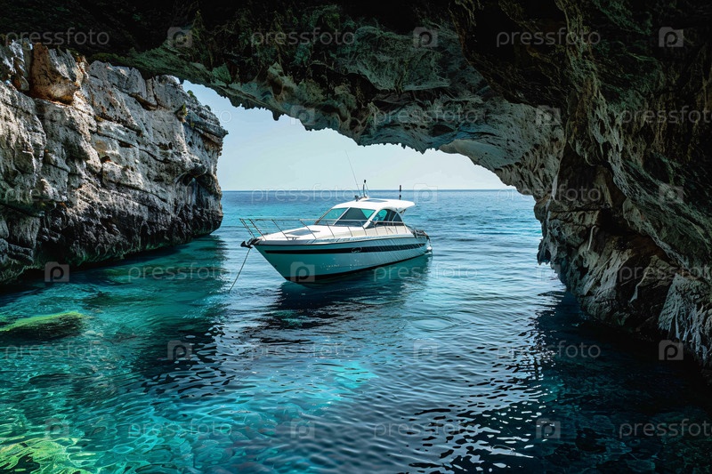 Роскошная яхта, проходящая через Голубую пещеру в живописном месте отдыха на море