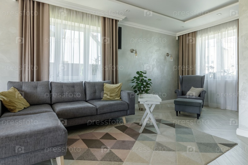 Стильная и уютная гостиная с серой мебелью, мягкими подушками и ковром с геометрическим узором создает комфортное и элегантное пространство для отдыха