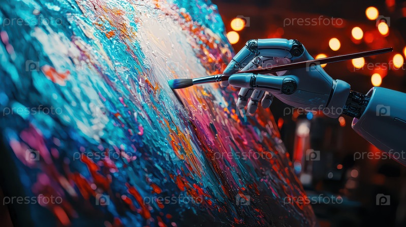 Робот-манипулятор рисует на холсте яркими цветами
