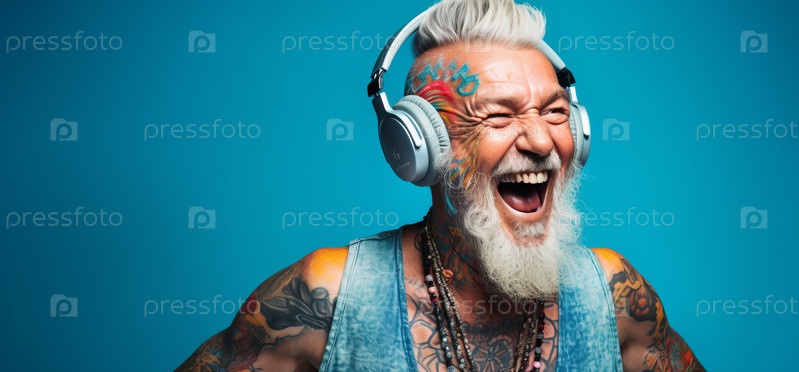 Радостный пожилой мужчина слушает музыку в наушниках