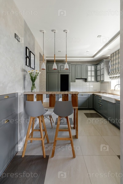 Просторная кухня оснащена серыми шкафами, деревянными столешницами и уютной обеденной зоной, залитой естественным светом