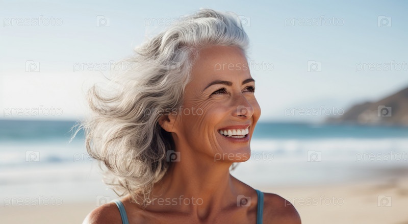 Портрет улыбающейся женщины, закутанной в одеяло на пляже