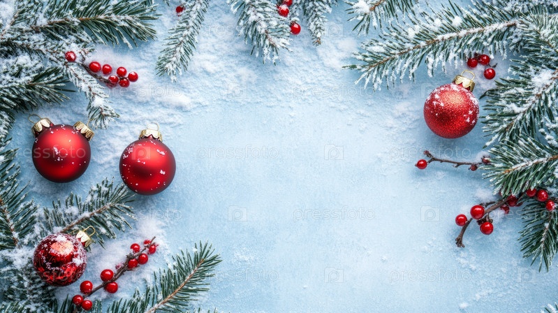 Рождественские украшения с заснеженными сосновыми ветками и красными шарами