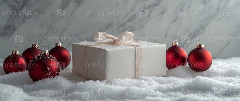 Красиво упакованный праздничный подарок, расположенный среди сосновых веток и украшений, воплощает дух Рождества с элегантностью и очарованием