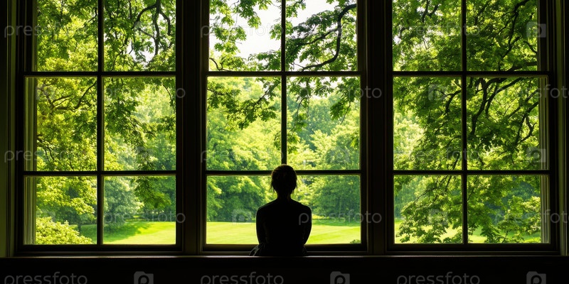 Рефлексивное спокойствие: женщина смотрит через окно на пышную зелень