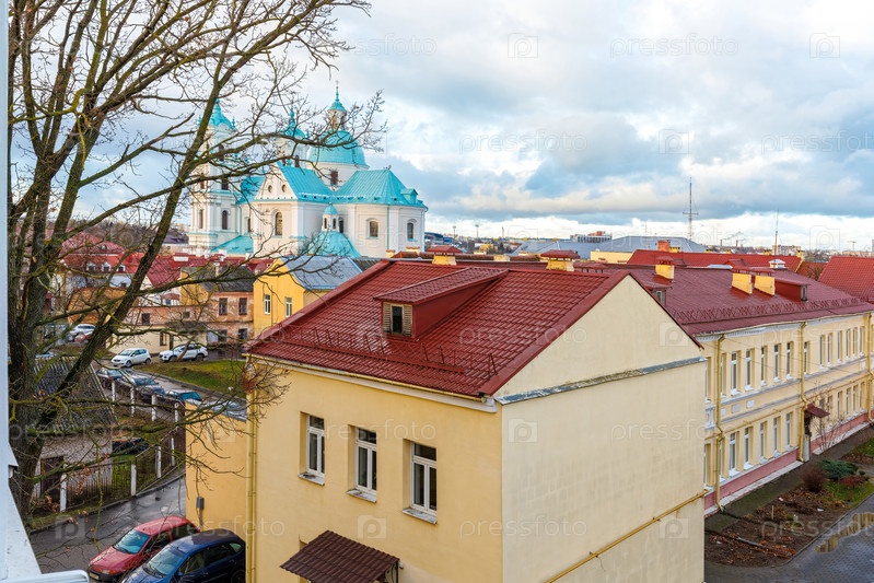 Живописный вид на крыши с куполом церкви на заднем плане на фоне облачного неба и жилых зданий