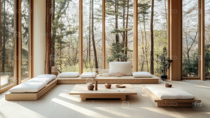Минималистичная гостиная в стиле дзен с деревянной мебелью и большими окнами