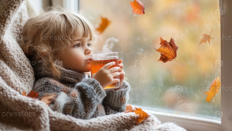 Ребенок, закутанный в уютный свитер, наслаждается теплой чашкой чая у окна, любуясь нежной красотой падающих осенних листьев, наслаждаясь безмятежным осенним мгновением