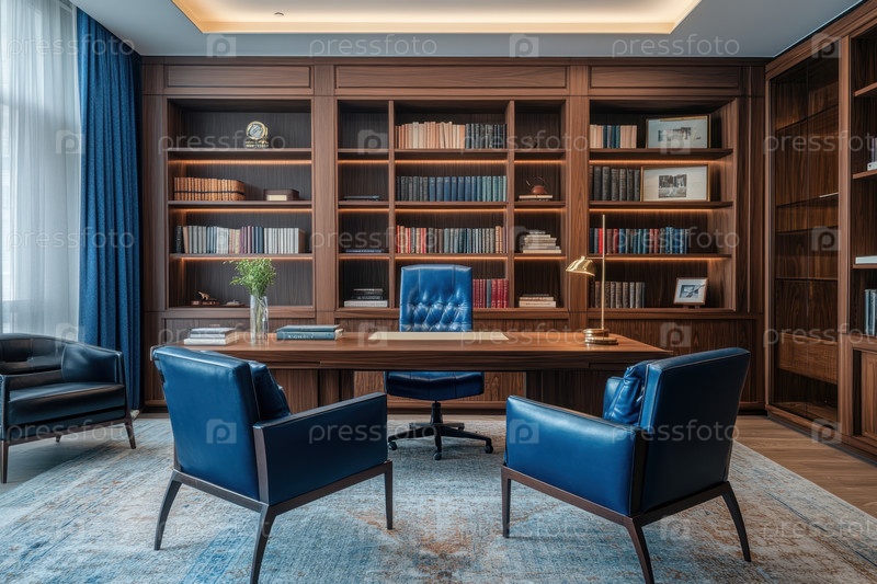 Элегантный кабинет руководителя с роскошными синими кожаными креслами и деревянными книжными полками