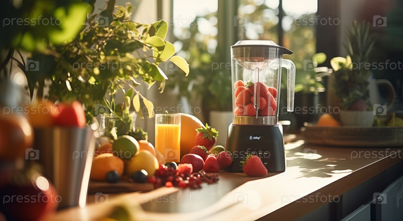 Стол с фруктами и овощами с блендером. Здоровое питание