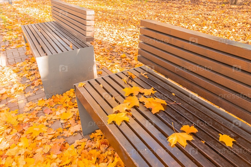 Парковые гранжевые скамейки осенью. Пустые скамейки в осеннем парке с листьями