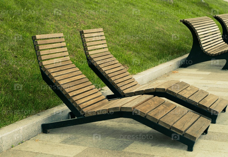 Пустые коричневые деревянные шезлонги или лежаки в городском парке. Концепция отдыха, загара