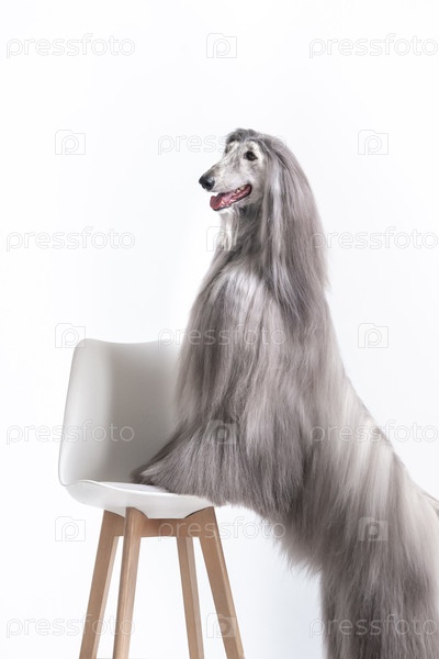 Афганская борзая стоит на белом фоне лапами на стуле