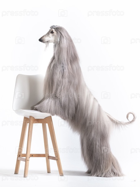 Афганская борзая стоит на белом фоне лапами на стуле