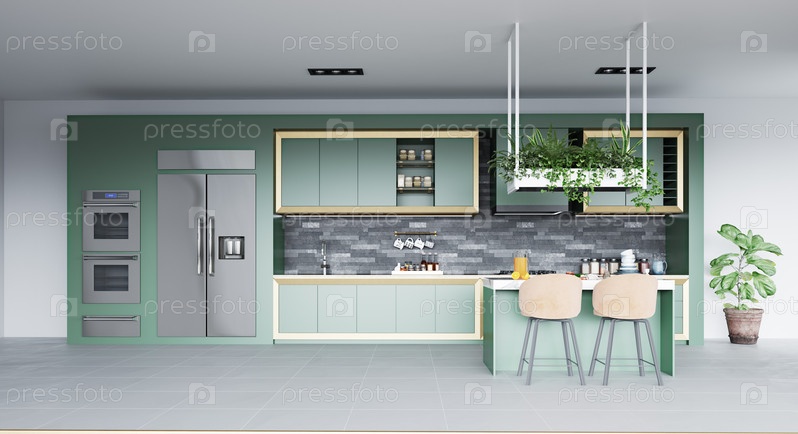 Открытая кухня с зелеными шкафами, мраморным полом и обеденной зоной. 3D-рендеринг