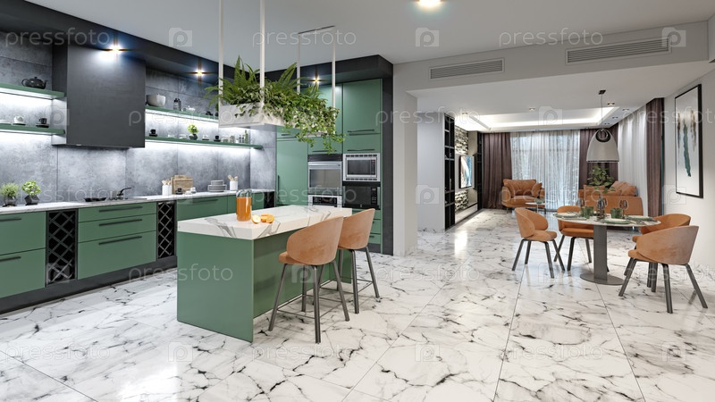Современная кухня с зелеными шкафами, деревянным полом и подвесными растениями. 3D-рендеринг