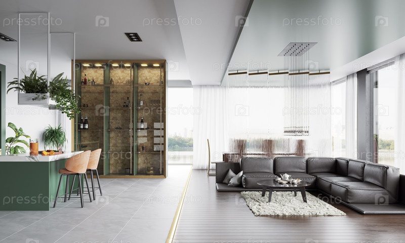 Современное открытое жилое пространство с зеленым кухонным островом,