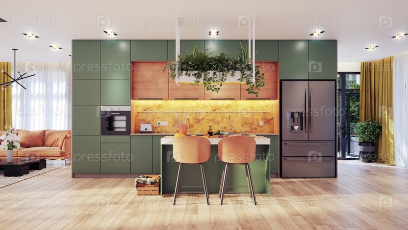 Яркая кухня с зелеными шкафами, оранжевыми акцентами и встроенным холодильником. 3D-рендеринг