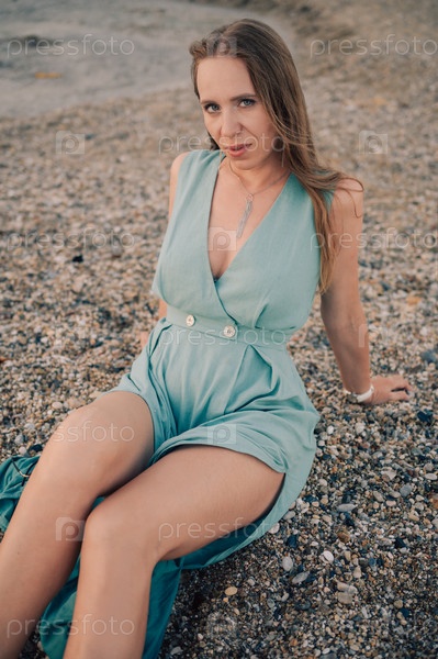 Женщина в развевающемся зеленом платье позирует на пирсе у моря на закате, на заднем плане развевается флаг Турции