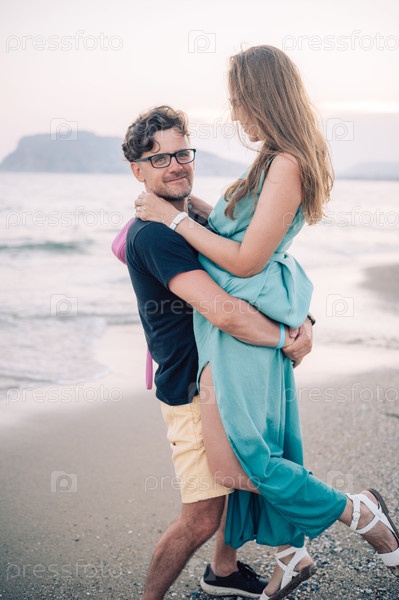 Счастливая пара обнимается на песчаном пляже