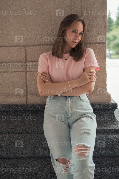 Повседневная молодая женщина, прислонившаяся к каменной стене