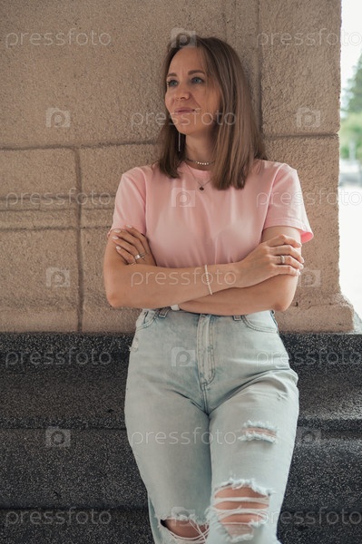 Молодая женщина в розовой футболке и рваных джинсах стоит на улице, задумавшись