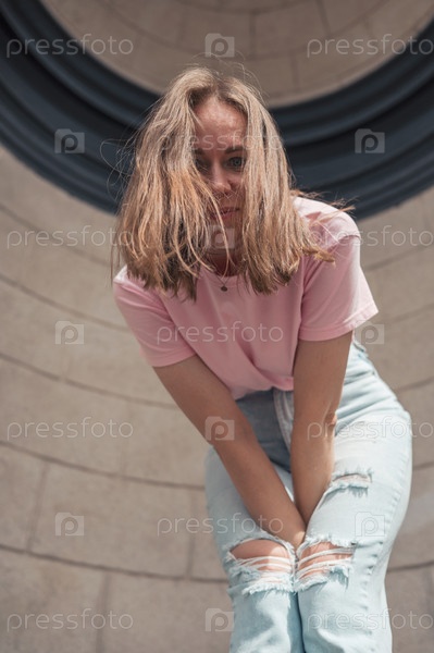 Радостная молодая женщина, прислонившаяся к каменной стене