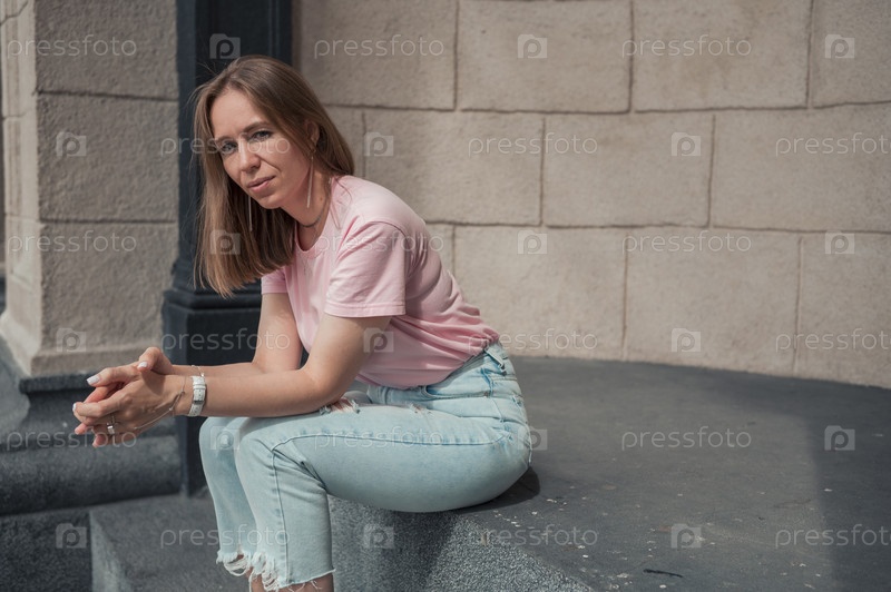 Стильная женщина в розовой футболке и рваных джинсах сидит на каменных ступенях, наклонившись вперед, с задумчивым выражением лица при естественном освещении