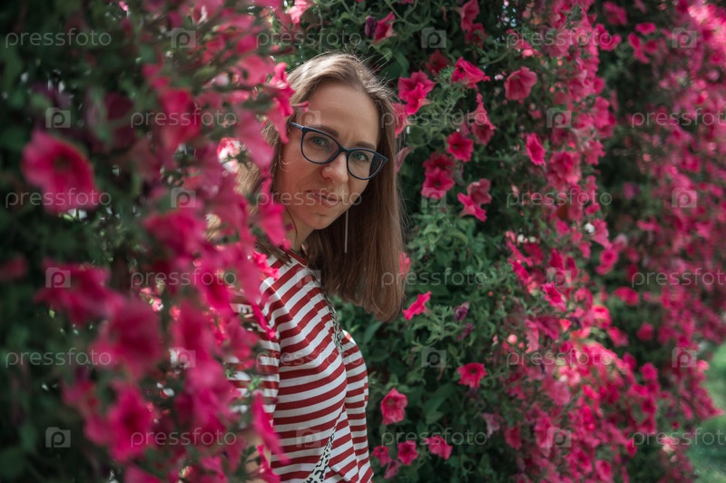 Улыбающаяся женщина в полосатой рубашке среди розовых цветов