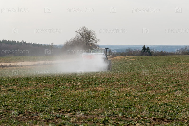 Трактор тянет разбрасыватель минеральных удобрений по зеленому полю