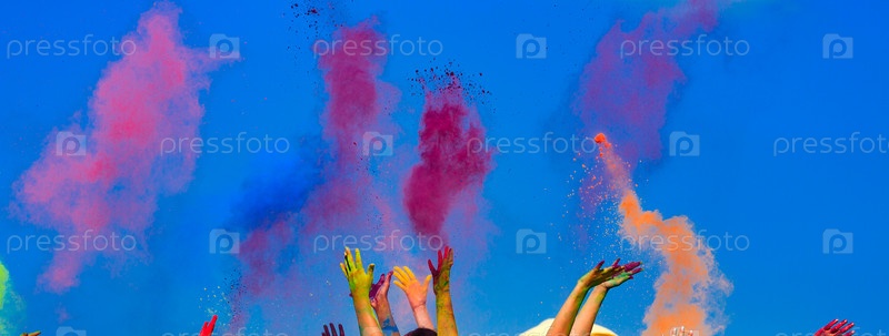 На красочном празднике Холи, руки подняты вверх, позади голубое небо