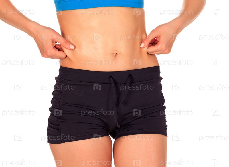 Подтянутая женщина сжимает жир на боках, изолированная на белом фоне