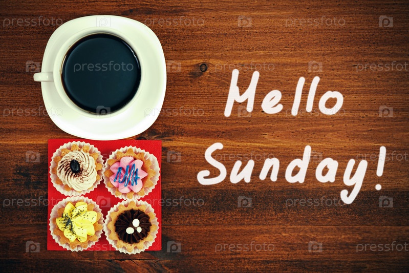 Привет, воскресенье! Чашка чая или кофе и четыре кекса на коричневом столе. Вид сверху, плоская планировка
