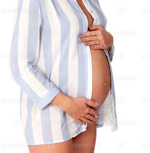 Крупным планом снимок живота беременной женщины, изолированный на белом фоне