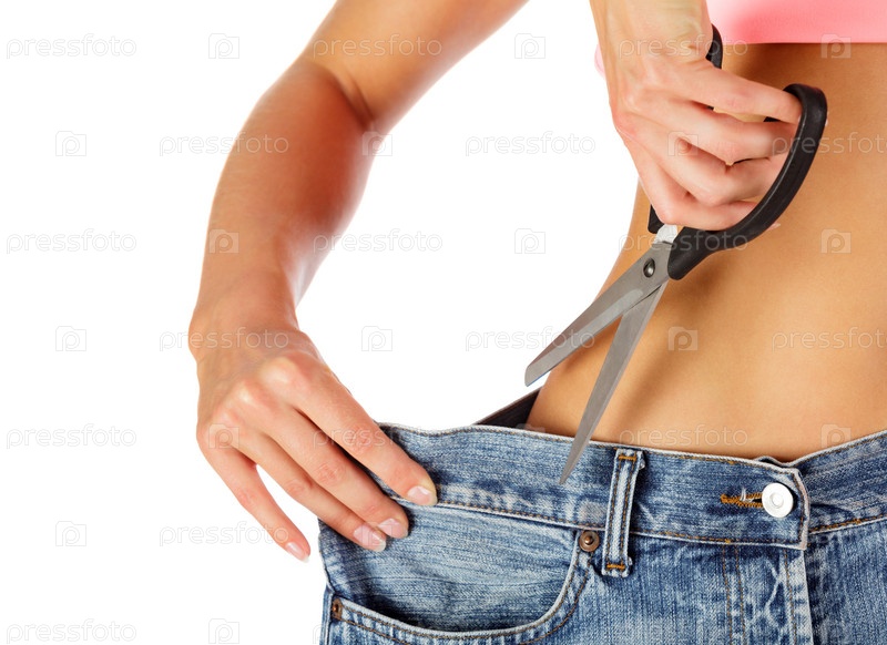 Концепция потери веса - крупный план женщины, показывающей ее прогресс в потере веса. Изолировано на белом фоне