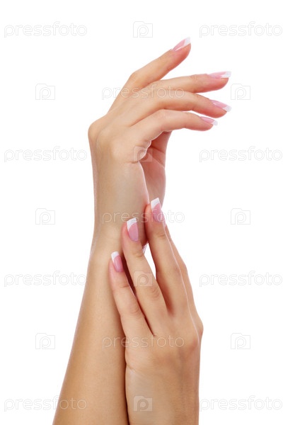 Крупным планом снимок женских рук с французским маникюром и чистой и мягкой кожей на белом фоне, изолированный