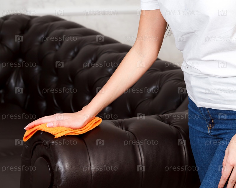 Снимок женской руки, вытирающей коричневый кожаный диван или софу