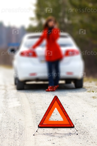 Женщина стоит возле сломанной машины и знака аварийной остановки