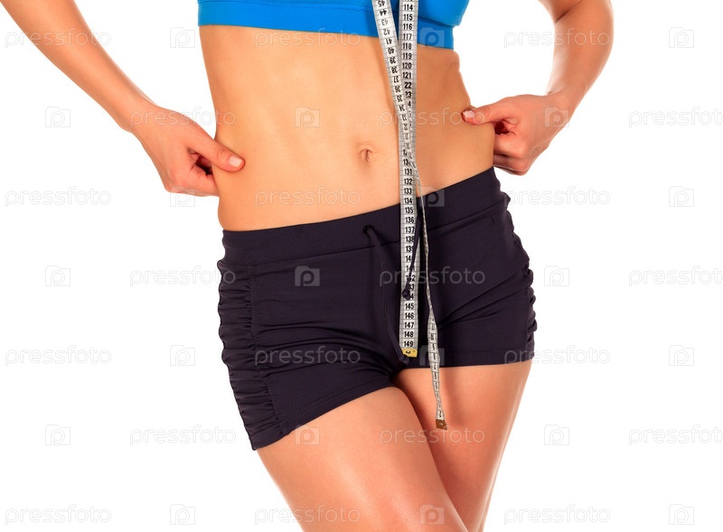 Подтянутая женщина сжимает жир на боках, изолированная на белом фоне