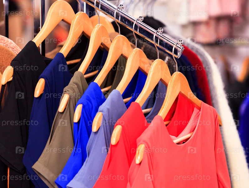 Крупным планом фотография одежды, висящей на полке в современном магазине модной одежды