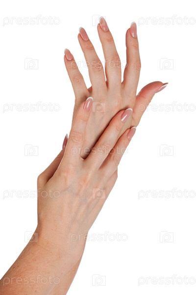 Красивые женские руки с французским маникюром на ногтях, изолированные на белом фоне